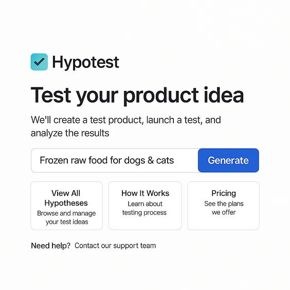Hypotest gives you AI tools to test business ideas faster and smarter. From your first concept to a ready-to-launch product — everything you need for clear, data-driven decisions.