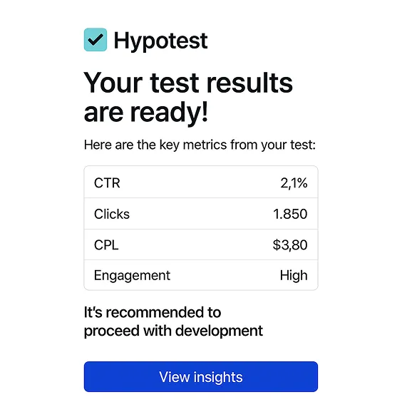 Hypotest gives you AI tools to test business ideas faster and smarter. From your first concept to a ready-to-launch product — everything you need for clear, data-driven decisions.